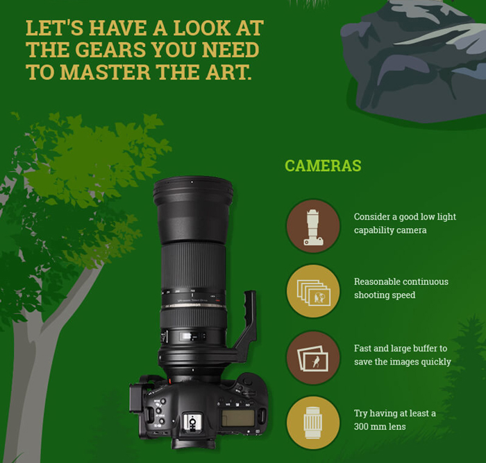 However, it is possible to capture a perfect wildlife photograph if you have correct equipment’s with you. Equipment’s in sense are not only cameras and lenses but along with them, there are many other components like binoculars for birds, macro lenses for insects, underwater cameras for marine photography, tripods to have still shots, etc. which in together help you ace the wildlife masterpiece.