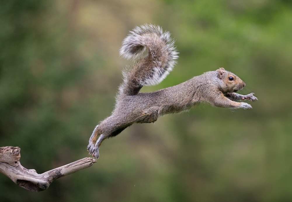 I used a Canon 1D X because I needed to shoot at 13 frames per second. Squirrels are speedy creatures, and jumping squirrels are even faster. I used a Vello FreeWave Plus Wireless Remote Shutter Release and a Gitzo tripod with an adjustable center column. I set the camera to Aperture Priority (AV) mode and an aperture of f/2.8 to get the speed I needed and to blur the background as much as possible.