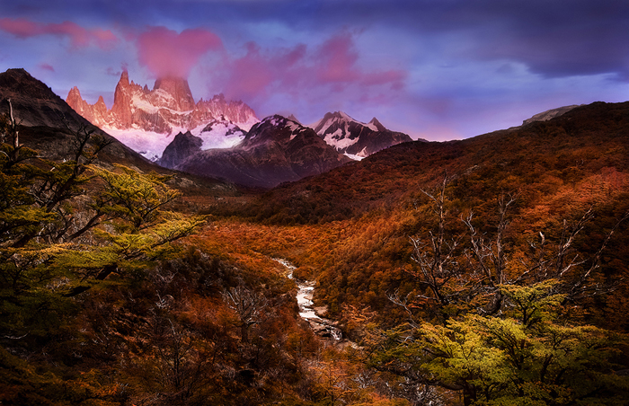 One afternoon, after completing my photography shooting near Poincenot camp-site, I decided to look for new locations near Laguna Capri. I hiked 6 km to Capri camp-site, set up my tent, and then went in search of new locations. From a vantage point at a cliff's edge, I discovered a small waterfall hidden in the forest. Although I already knew the creek and the valley from my topographic map, the waterfall was not marked at all. Early morning, I returned to this location and captured a dramatic sunrise (see photo below).