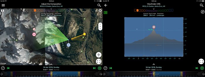 I really wanted to take a unique picture of this waterfall. By using the app PlanIt! for Photographers, I carefully chose my shooting time. I discovered that there was only one day from April to May, i.e., 24 April 2016, when the setting moon would appear right above the Fitz Roy peaks, and at the same time, the rising sun would just be high enough to project its light towards the peaks and make them shine.