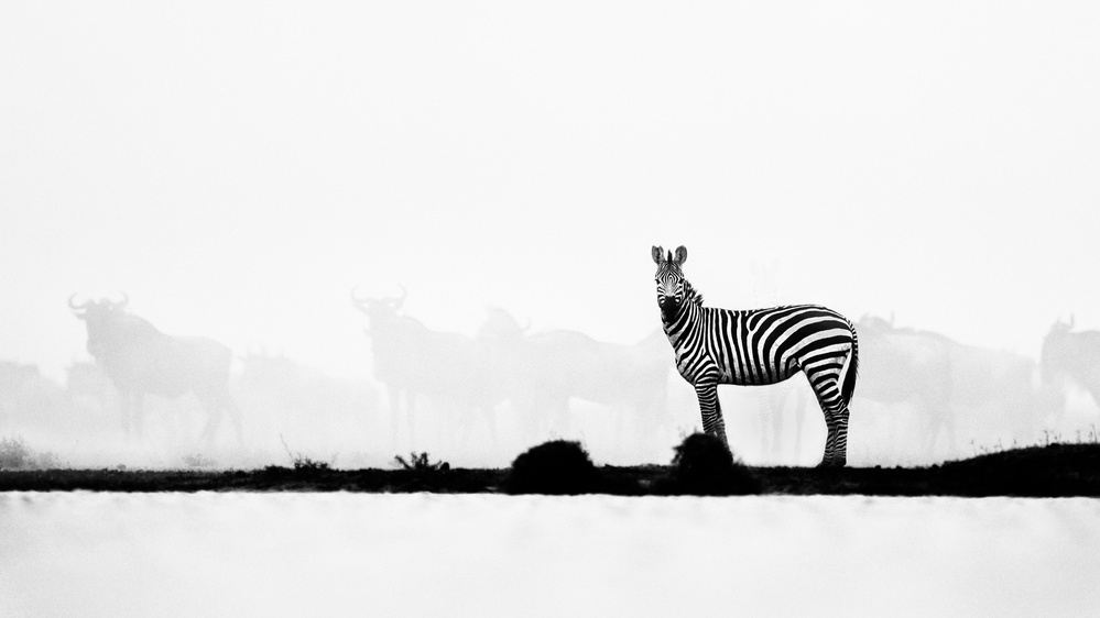 Ndutu during calving season, very cautious zebras and wildebeest gather to drink water and get a nice swim. However, with any sound, the chaos happens and dust flies everywhere, which creates dramatic scenery. in the photo, this Zebra was the last one to leave the water pond and gave me a final stare before it went away.
