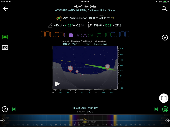 Since I had been to Minaret Lake in 2013, I knew where would be a desirable shooting location. To make our plan as precise as possible, we used Planit! to set our preferred camera location and the scene location that included Minaret peaks into the frame. Then by sliding the time-bar, the app would automatically show the prediction of the Milky Way appearance position in relation to the pre-defined composition.