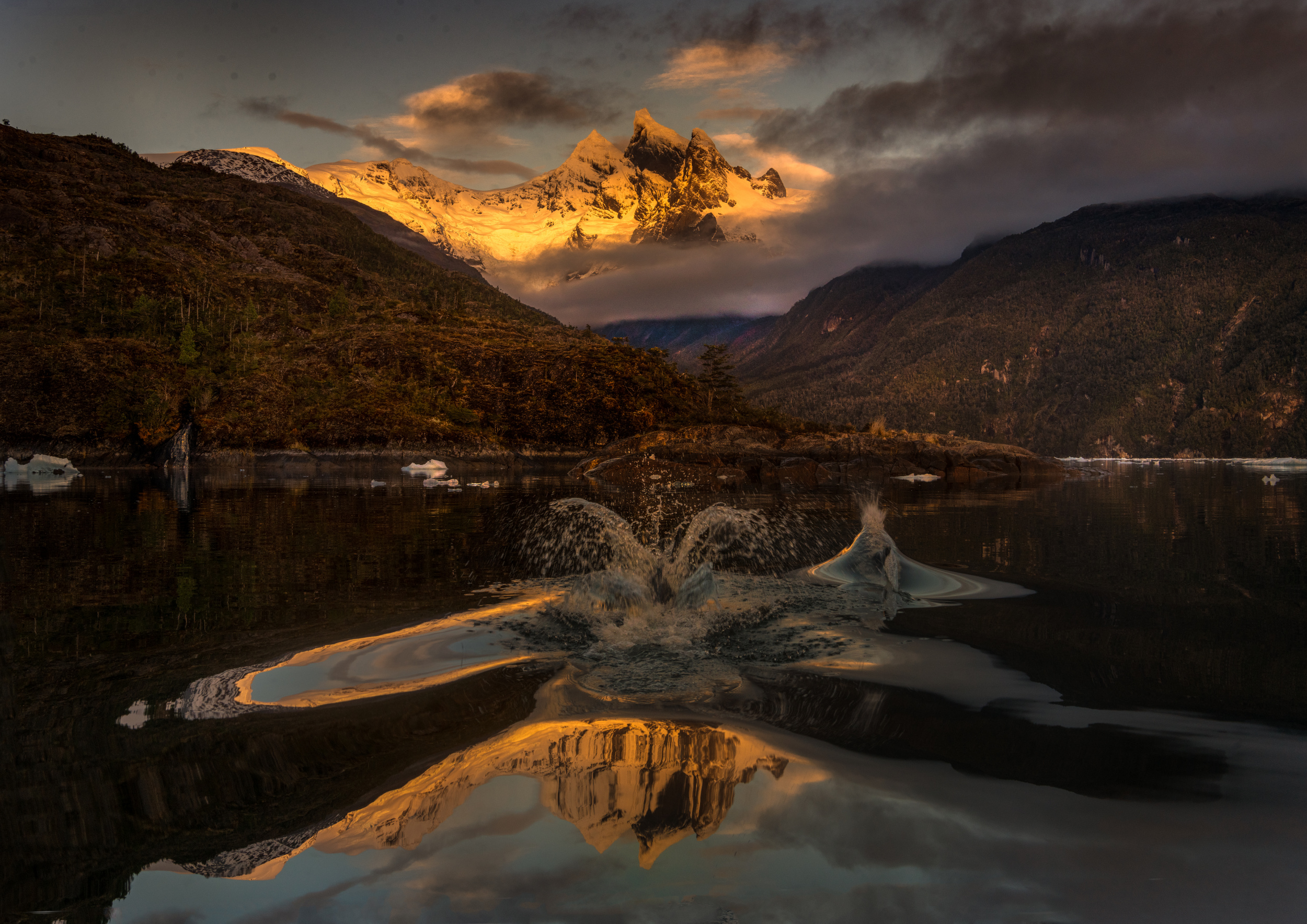 'Evening in Patagonia Fjord – Two dolphins jump toward the three sisters peaks in evening hours'