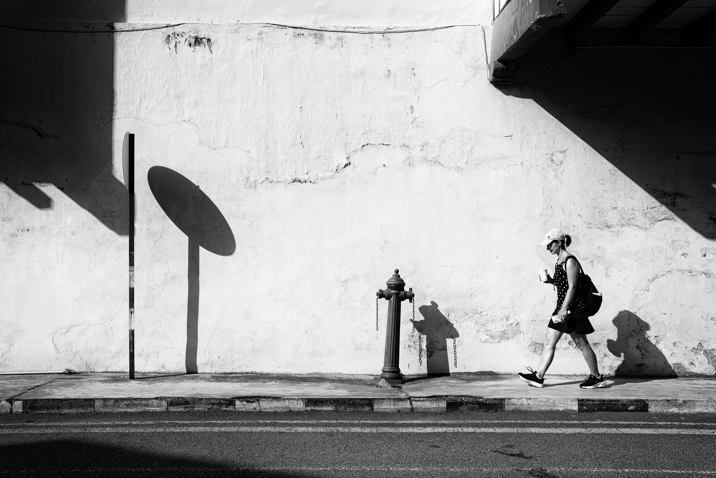 This photo was taken during a trip to Malaysia, in Penang, where my girlfriend and I were going to a tourist spot. Since we like to walk long distances, we decided to go on foot despite the late morning heat. The sun was still low enough to cast shadows at an angle, yet strong enough to create pronounced shadows. They stood out even more because the wall in the background was relatively light, a yellowish grey. I'm drawn to the interplay of light and shadow, so the scene immediately caught my eye. However, I felt it lacked a lively element to add a dynamic touch to the static duo of traffic sign and fire hydrant, turning the pair into a trio. This odd number is somehow more "photogenic" or compositionally pleasing.